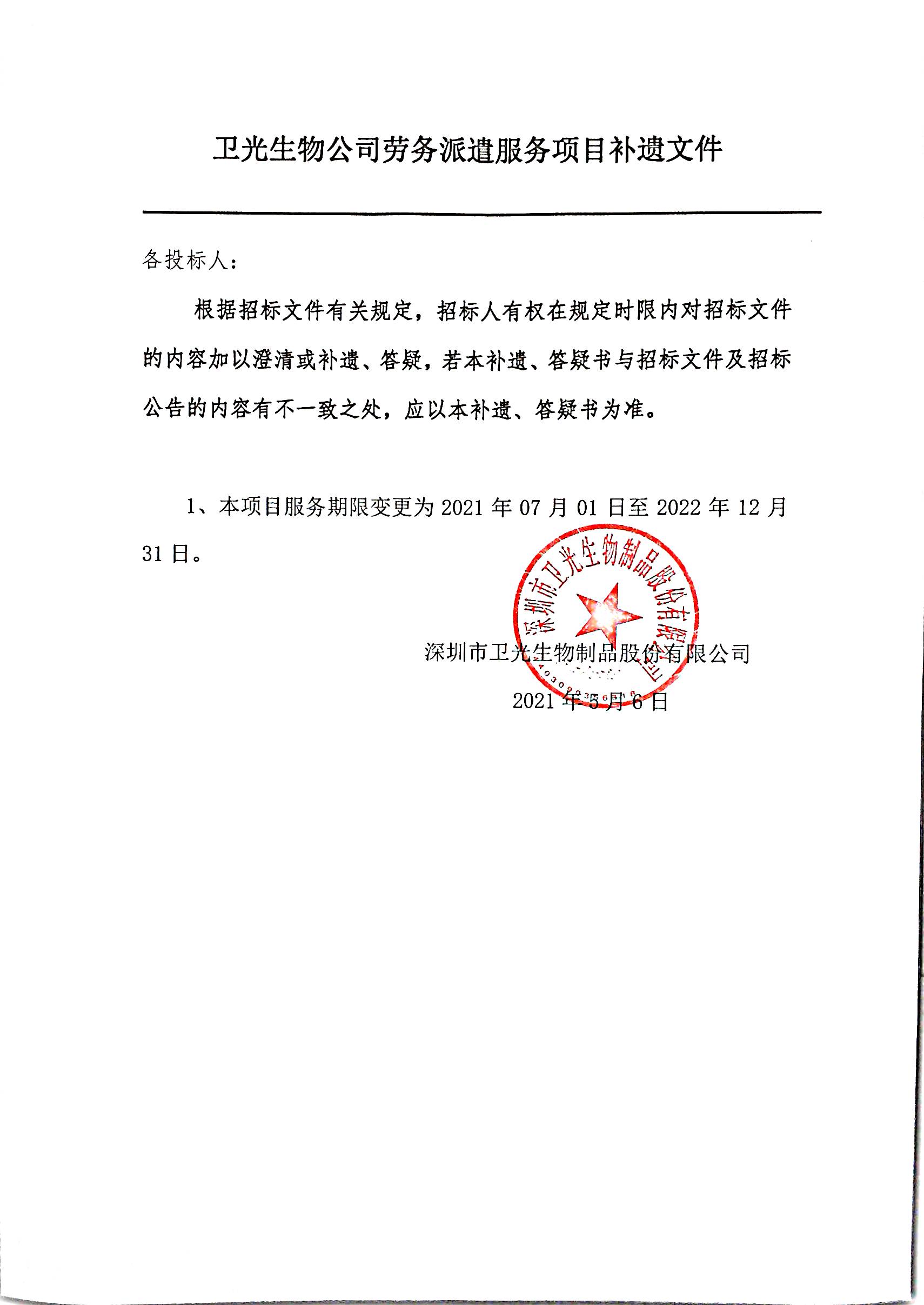 卫光生物公司劳务派遣服务项目补遗文件(服务期限变更)