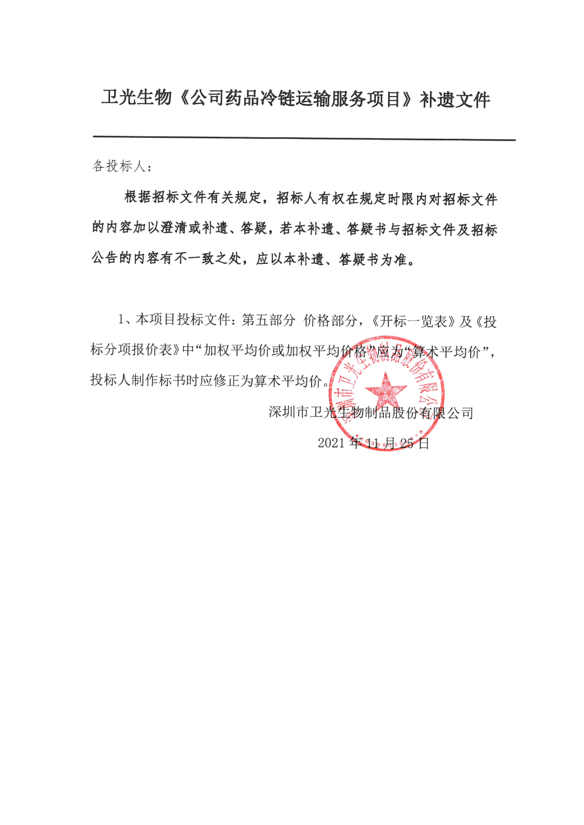 卫光生物公司《药品冷链运输服务项目》补遗文件