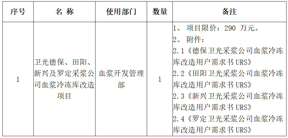 深圳卫光生物制品股份有限公司因生产经营需要,现对卫光生物德保、田阳、新兴及罗定采浆公司血浆冷冻库改造项目进行公开征集供应商,欢迎具有相应资质的单位前来参与。