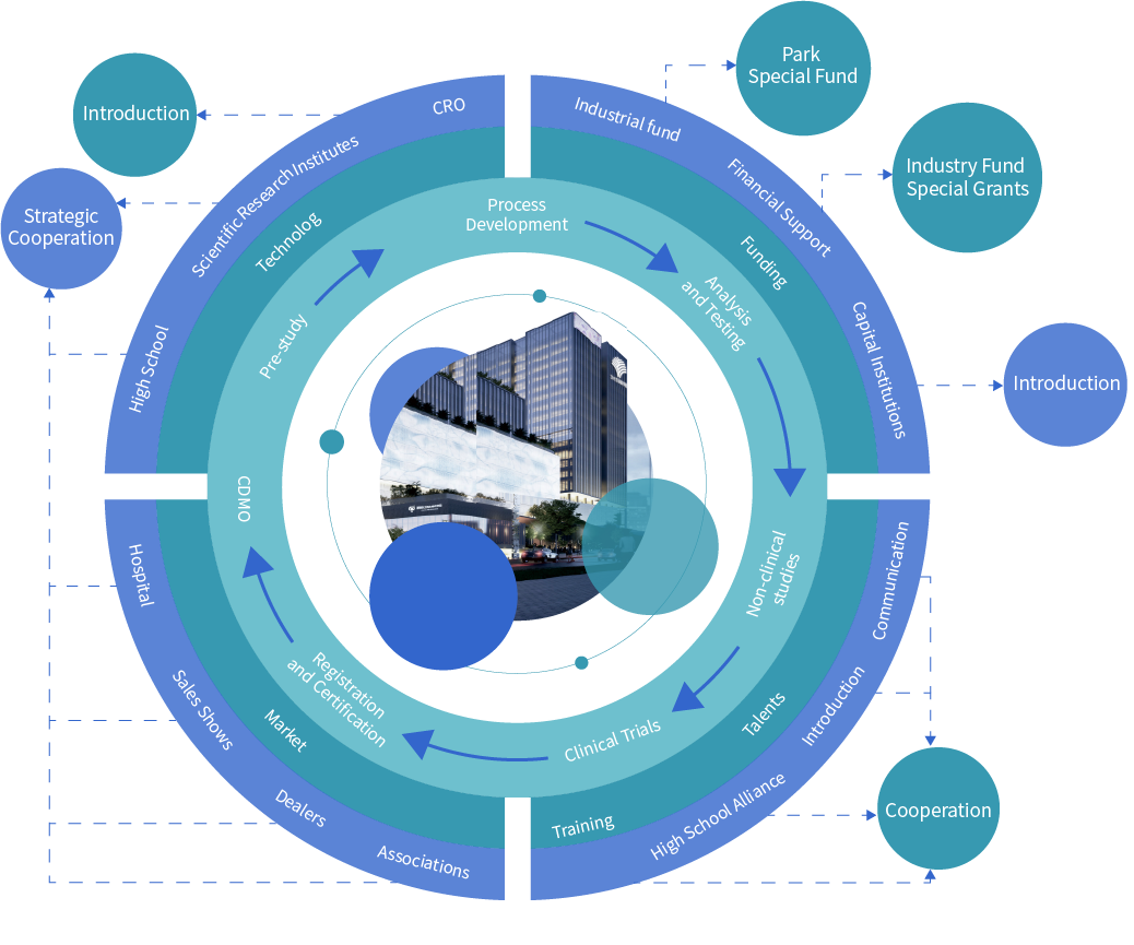 The complete industry chain ecology from basic research, drug discovery, CMC. non-clinical IND, clinical research, NDA, manufacturing, distribution to the terminal