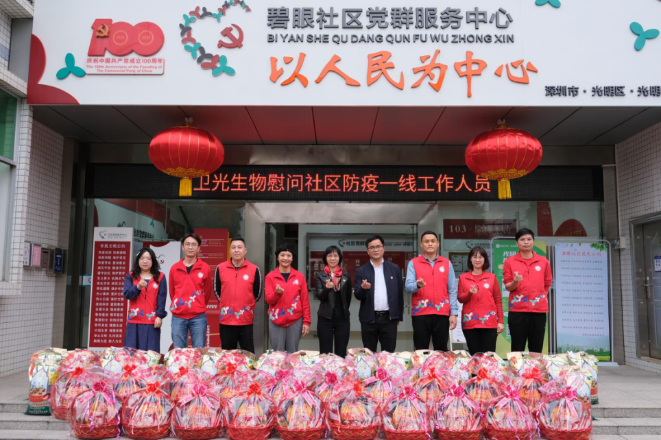 2022/2/81月26日下午,市党代表、公司党委委员、总经理郭采平同志带队到光明区碧眼社区开展“市党代表进社区”活动,并代表卫光生物向疫情防控一线人员送上慰问品及新春的祝福。